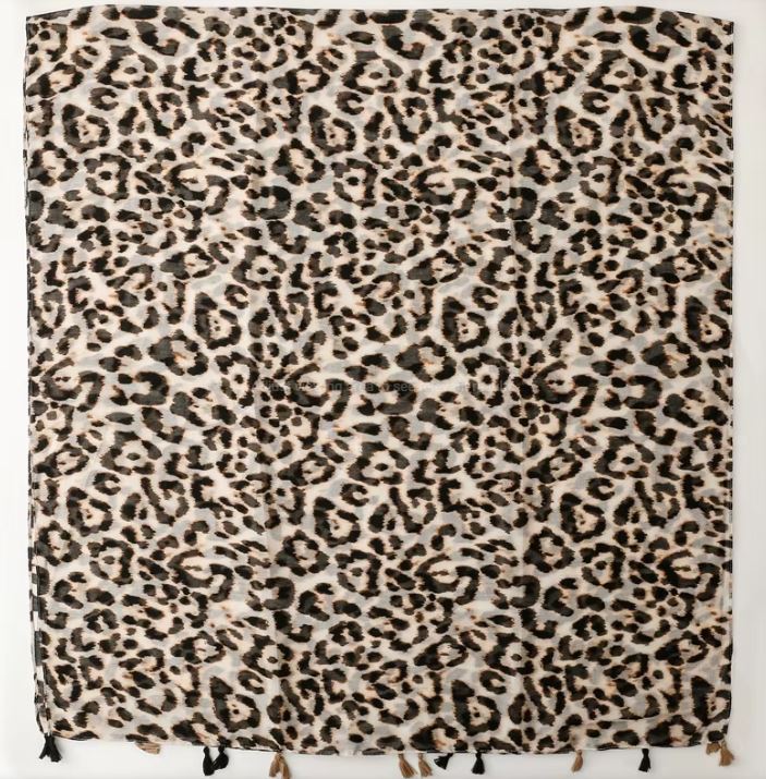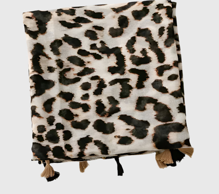 This is a stunning fashion scarf, featuring a bold and modern panther pattern in a beige and sand color crafted from a luxurious blend of natural fabrics, including soft viscose and breathable cotton, this scarf offers both comfort and style.